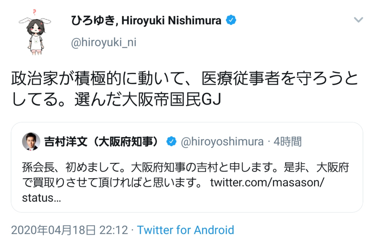 ひろゆき, Hiroyuki Nishimura @hiroyuki_ni 政治家が積極的に動いて、医療従事者を守ろうとしてる。選んだ大阪帝国民GJ