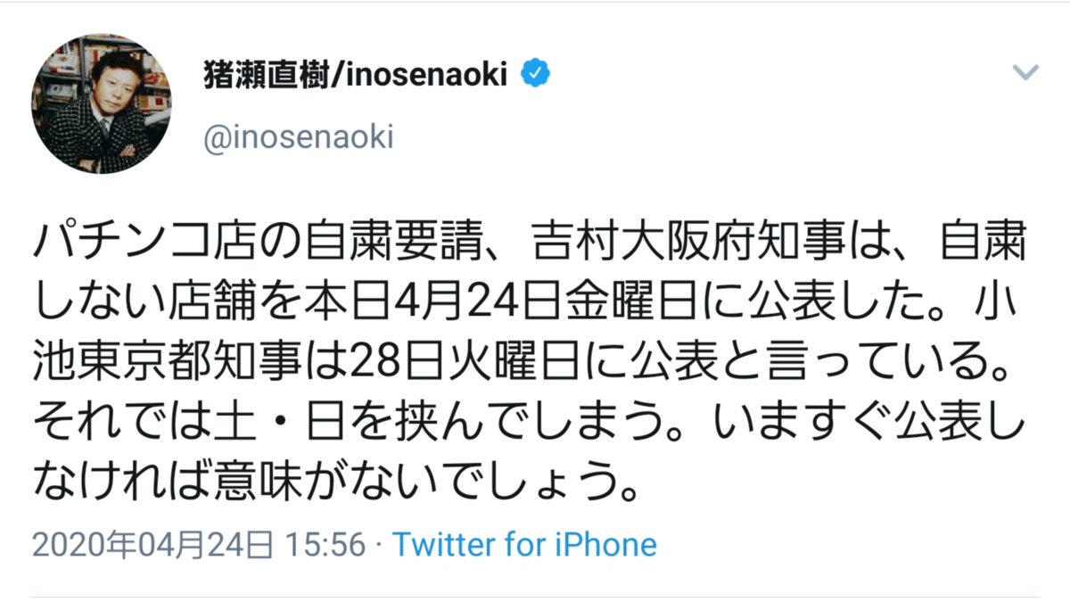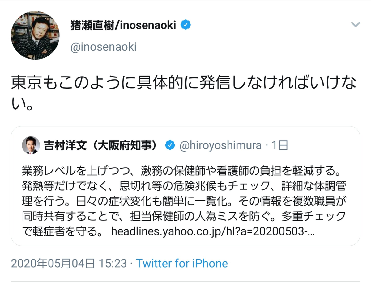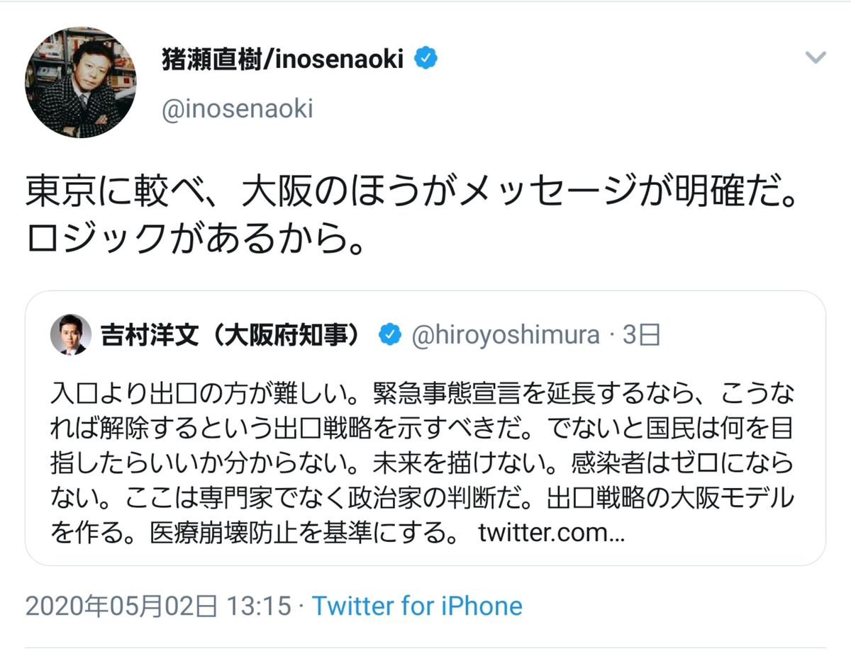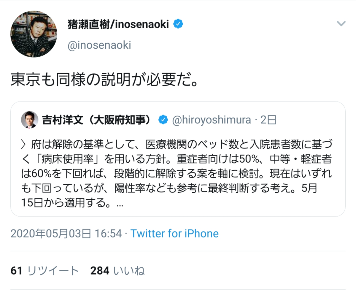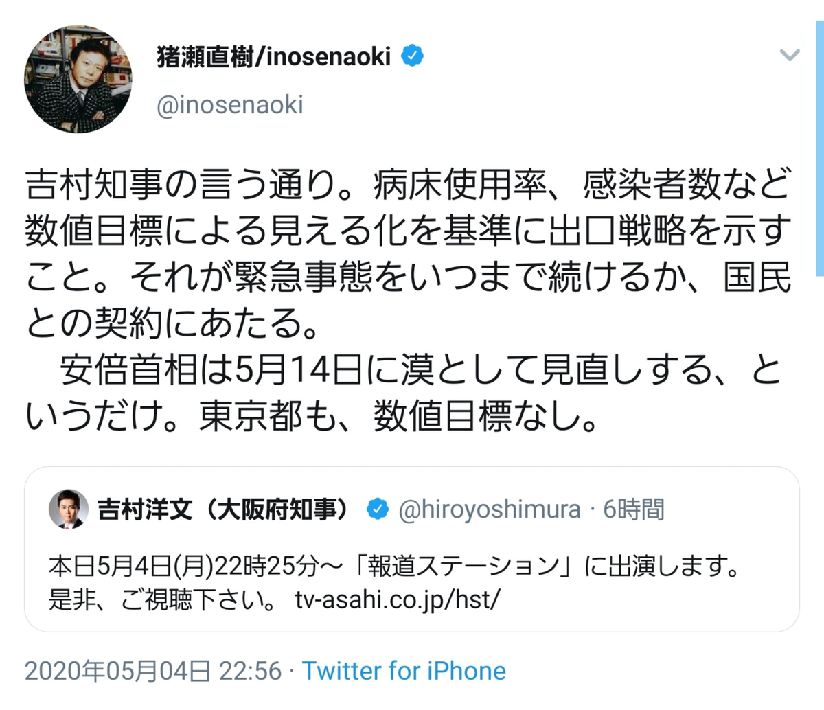 ■猪瀬直樹/inosenaoki @inosenaoki 吉村知事の言う通り。病床使用率、感染者数など数値目標による見える化を基準に出口戦略を示すこと。それが緊急事態をいつまで続けるか、国民との契約にあたる。 安倍首相は5月14日に漠として見直しする、というだけ。東京都も、数値目標なし。