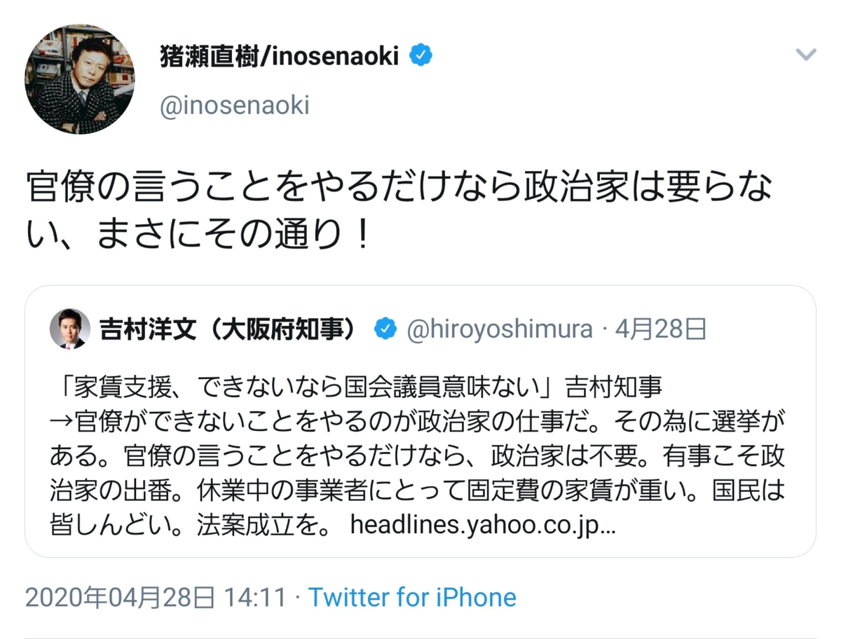 ■猪瀬直樹/inosenaoki @inosenaoki 官僚の言うことをやるだけなら政治家は要らない、まさにその通り! 吉村洋文(大阪府知事) @hiroyoshimura · 4月28日 「家賃支援、できないなら国会議員意味ない」吉村知事 →官僚ができないことをやるのが政治家の仕事だ。その為に選挙がある。官僚の言うことをやるだけなら、政治家は不要。有事こそ政治家の出番。休業中の事業者にとって固定費の家賃が重い。国民は皆しんどい。法案成立を。