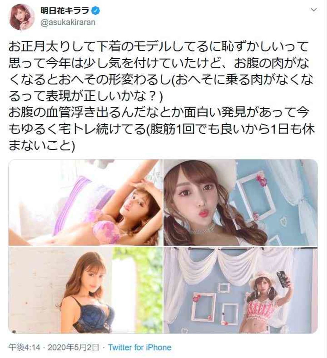 あわせてモデル撮影のオフショットを投稿し、磨き上げられた美しいプロポーションを披露した明日花。その後には、外出自粛が続く現状を踏まえ「言い訳(コロナ)太りだけはしたくない」と思いを綴っていた。明日花キララ、ランジェリーモデル経て「面白い発見」ストイックさに注目集まる - モデルプレス