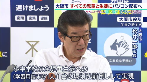 5月7日、大阪市の松井一郎市長は、新型コロナウイルスへの感染拡大を受けて休校が続いている“小中学校の全ての児童・生徒にノートパソコンを配り”、オンライン学習ができる環境を整えると発表しました。