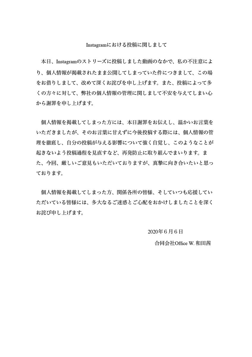 「和田さん。はその日のうちに、個人事務所『Office W.』の公式サイトで個人情報の漏えいについて謝罪しました。ところが、その謝罪文はなぜか“画像化”されていて、ページの保存もできないようになっていたんです。さらに、掲載ページがサーチエンジンで検索に引っかからないよう、わざわざタグを入れていることも発覚。ネット上では『人の目に触れないように小細工してるの?』『この騒動を大きくしたくないって気持ちがバレバレ。やることがセコい』『和田さん。の対応は不誠実だと思う。好きだったのに、印象がどんどん悪くなる』と、反感を買っています」(芸能ライター)