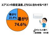 結果を見ると、エアコンの設定温度を「暑がり」に合わせるべきと回答した人は全体の74.6%(1413票)。「寒がり」に合わせるべきと回答したのは全体の25.4%(480票)で、圧倒的に「暑がり」に合わせるべきという意見が優勢となっている。 その理由として、ツイッターでは、 「会社にめっちゃ暑がりな人がいるんだけど、見ていて毎日つらそうで可哀想。エアコンの温度って暑がりなの人に合わせるべきだと思う。寒い人は、一枚羽織ればいいけれどその逆は出来ないんだし」 「エアコン温度論争はさ、暑がりに合わせるしかないんだよ。寒けりゃ服着ればいいけど、暑いからって服脱いだって涼しくはならないからさ」 といったような意見が。職場の「エアコン戦争」ついに決着 全国調査の結果→75%が「暑がりに合わせるべき」 - Jタウン研究所 - Jタウンネット