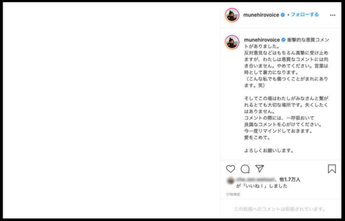 反対意見などはもちろん真摯に受け止めますが、わたしは悪質なコメントには向き合いません。やめてください。言葉は時として暴力になります。