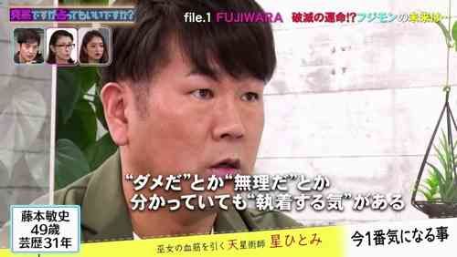 1 匿名さん 20/09/05(土) 22:21 星から「本当は(元妻に)執着がある。ダメだとか無理だと分かっていても執着する“気”がある」「離れることによって余裕が生まれる」と言われると、フジモンは「まったくその通りです」と“完落ち”。そして、「もう正直ね、ちょっとオレ間違ってたのかなと、ここ何か月間すごく思ってた。違う方向に方向転換した方がいいのかなと思ってた」と、何やら昨年末、離婚という判断を下したことを後悔しているような言いぶりだったのだ。
