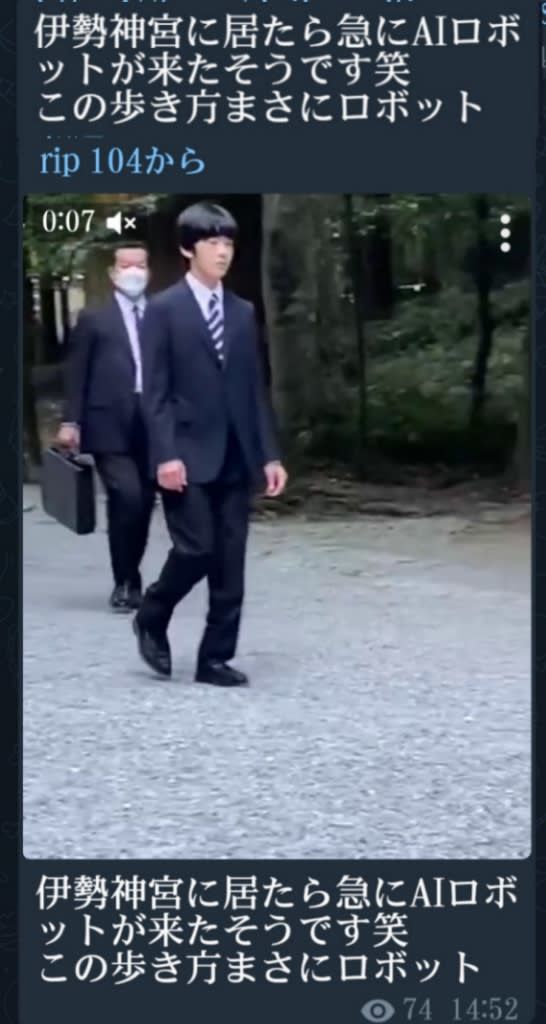 --- 日本の○室さまがAIロボット!伊勢神宮に居たら急にAIロボットが来たそうです笑!動画/この歩き方まさにロボット!天皇陛下もズボン前後逆さま!偽天皇家が、ひっくり返るという意味 - みんなが知るべき情報gooブログ ---