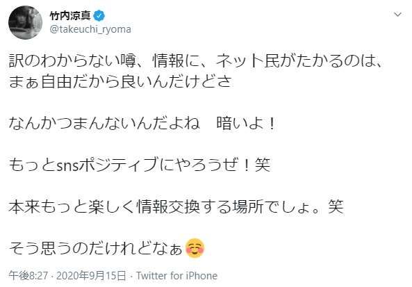 俳優の竹内涼真(27)が15日、自身のツイッターでSNSの使い方について「もっとポジティブにやろうぜ!」と呼びかけた。  竹内は、誹謗(ひぼう)中傷や根拠のない噂が飛び交う昨今のネット事情を憂い「訳のわからない噂、情報に、ネット民がたかるのは、まぁ自由だから良いんだけどさ なんかつまんないんだよね 暗いよ!」と自身のツイッターに投稿。「もっとsnsポジティブにやろうぜ!笑 本来もっと楽しく情報交換する場所でしょ。笑 そう思うのだけれどなぁ」と心の内をつづった。  これには「その通り!SNSは楽しい場所。攻撃する場所じゃない」「楽しい事、感動やプラスになる情報を交換して自分の人生を豊かにするものよね!SNSって!」「自由だけど、人を傷つけたり、不快にさせるのは違うよね」「俳優さんが言葉を発するのって凄く勇気が。言ってくれて嬉しいです」「涼真くんの言う通りだと思うし、そう思える涼真くんは本当に素敵です」と多くの賛同のコメントが寄せられた。
