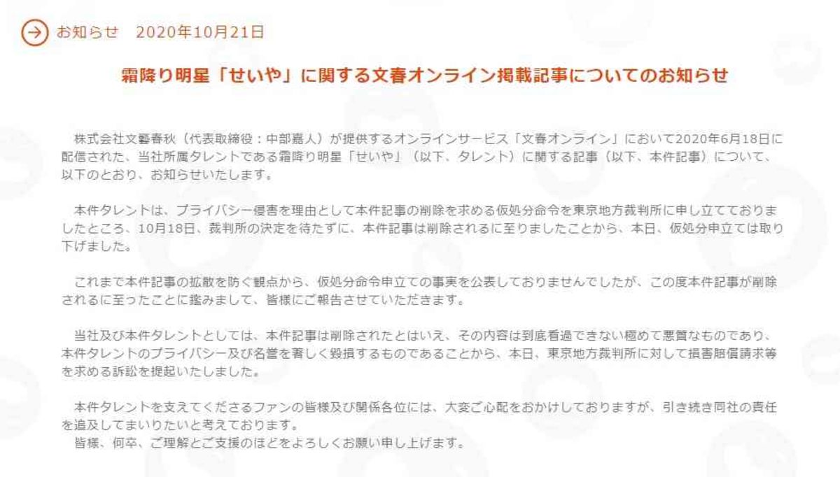 内容は、吉本所属のお笑いコンビ「霜降り明星」のせいやが、一般女性と2人でオンライン飲み会をした際、ズボンを脱いで自慰行為を見せていた、というもので、せいやが自慰行為する写真も掲載されていた。霜降り明星・せいやの〝ハレンチ写真〟掲載問題 吉本興業が文春を提訴 – 東京スポーツ新聞社