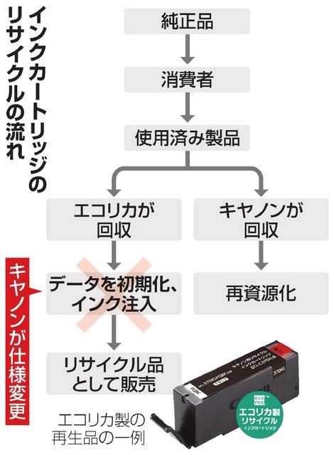 エコリカによれば、同社は2003年から、キヤノンなどのプリンターで使う使用済みインクカートリッジを家電量販店などから回収。カートリッジにインクを再注入して純正品より2~3割ほど安く販売してきた。 訴状によると、キヤノンは17年9月に発売したインクカートリッジでインク残量を表示するICチップの仕様を変更し、インクを再注入してもプリンター上で「インクなし」と表示されるようになり、リサイクル品を製造・販売できなくなったと主張する。カートリッジ会社がキヤノン提訴へ 「仕様変更は違法」:朝日新聞デジタル
