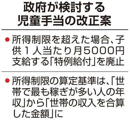 政府は現在の所得制限基準を据え置いたまま特例給付を廃止した場合、900億円程度の歳出削減効果を見込んでいる。さらに、これまでは夫婦共働きの場合、どちらか多い方の年収が所得制限内に収まれば原則支給対象にしていたが、世帯内で合算した額を基準とするよう改める方向だ。 共働き世帯で夫婦の年収がいずれも所得制限を下回る場合、世帯の収入を合算した額が基準となることで、満額支給されていた手当がゼロとなるケースが生まれる可能性もある。児童手当の特例給付、廃止検討 待機児童解消の財源に(産経新聞) - Yahoo!ニュース