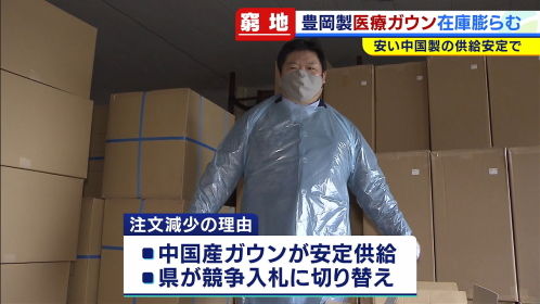 緊急事態宣言の解除以降、注文が減り始め、9月以降はほとんどなくなりました。価格が3分の1程度の中国産ガウンが安定して供給されるようになったことに加えて、当初は随意契約を結んでいた県が競争入札に切り替えたことが大きく影響しました。在庫は約11万枚にも膨れ上がっているといいます。「医療用ガウン」国内生産したのに“在庫11万枚”…安い中国製が選ばれ生産中止検討 | MBS 関西のニュース