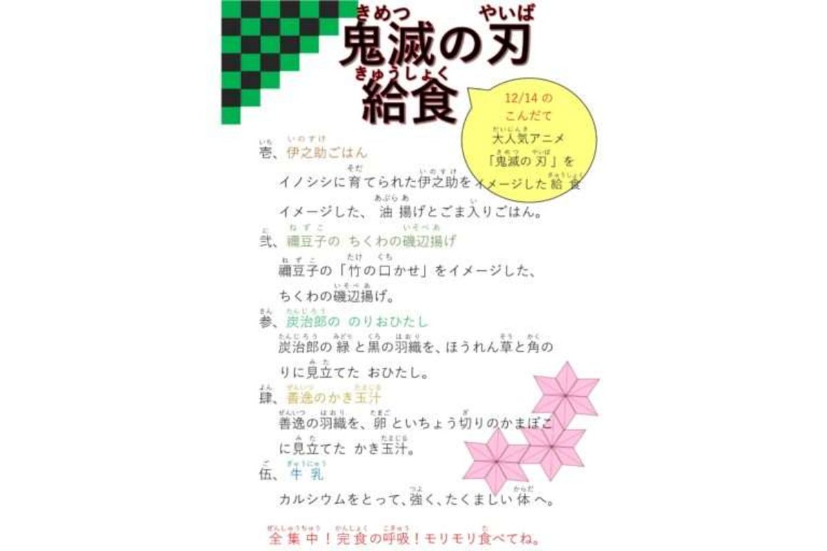 ■登場人物をイメージした献立 長野県御代田町では、(略)「全集中! 完食の呼吸 伍ノ型 鬼滅の刃給食」が町内の3小中学校の児童・生徒約1,380人に提供された。この献立が発表されて以来、この日を楽しみにしていた子供たち。本田養護教諭は「当日は大盛況だった」と話す。 ■キャラクターの好物を献立に 岐阜県笠松町内の小中学生約1,800人は、昨年の10月に「炭治郎の思いやり&おもてなし給食」を楽しんだ。『鬼滅の刃公式ファンブック 鬼滅隊見聞録』には、登場人物の好物についての記載がある。小・中学校の『鬼滅の刃』給食が話題 どこが鬼滅なのかメニューに込めた想いを直撃