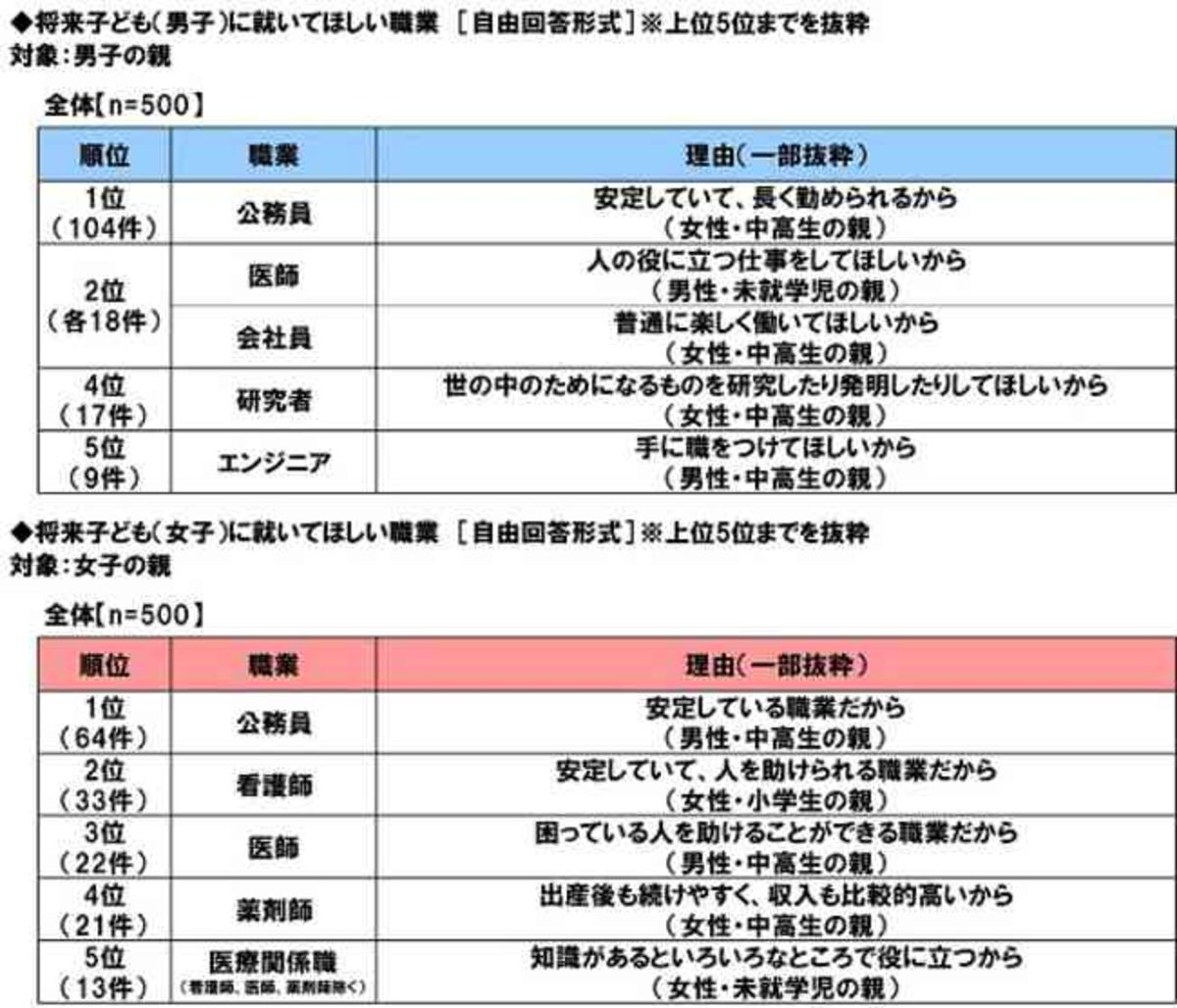 親が子どもに就いてほしい職業1位「公務員」 2位は男子「医師」、女子「看護師」