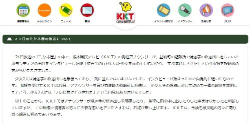熊本県民テレビが熊本地震の避難所取材で少女をどかしたとの批判に反論した。公式サイトで、少女らはインタビューが始まったので自発的に退いたと説明。少女らに「TV局にどかされた」との自覚はなかったと確認していると綴った