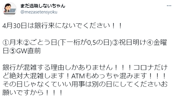 銀行員のまだ退職しないちゃん(@mezasetensyoku)さんは、こんなお願いを投稿しました。 4月30日は銀行来にないでください!!①月末②ごとう日(下一桁が0,5の日)③祝日明け④金曜日⑤GW...