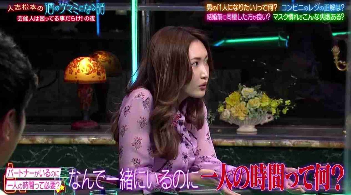 紗栄子は共演者に結婚、お付き合いしているときに「一人の時間って欲しかったりします?必要と思います?」と疑問をぶつけた。松本人志(57)は「僕はめちゃくちゃ欲しいです」と答えた。紗栄子は「仕事以外の時間は四六時中ずっと一緒にいたいタイプ」とし「ご飯食べるのも、寝るのも、お風呂入るのも全部一緒がいい。トイレだけ別かな」と常にパートナーが横にいてほしいと訴えると、松本は「すっげぇー」と驚いていた。 (略)紗栄子は「帰ってくる時間も教えてほしい」とした。「なぜなら、お風呂入りたかったら、すぐ入れる状態にしておきたいし、ご飯食べたかったらお味噌汁を温かい状態にしときたいから、帰る時間教えてって思うんですけど」と相手を思っての行動も「要所要所でやりすぎちゃって、いつも怯えられて離れていかれちゃう」と嘆いた。