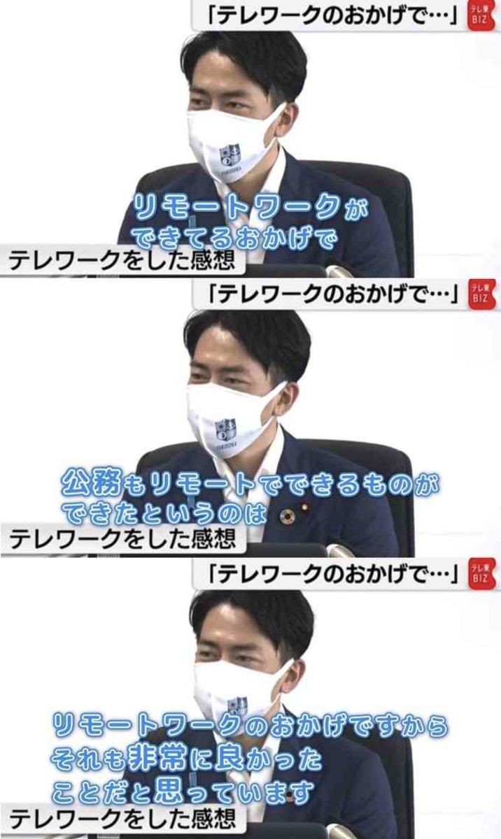 小泉環境相は「退院後、リモートワークができてるおかげで、公務もリモートでできるものができたというのは、リモートワークのおかげですから、それも非常に良かったことだと思ってます」とリモートワークへの感謝(?)の気持ちを述べていた。小泉進次郎「リモートだからリモートができた」新たな“構文”の誕生が話題に - まいじつ