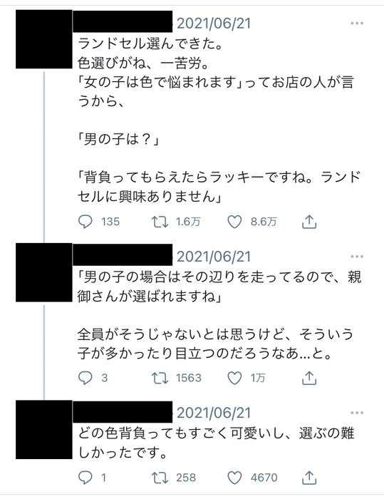 このツイートに対してリプ欄は、 「店員さんの通りな我が家の姫太郎です。娘は色は好きだけどここのデザインが嫌とかでケンケンしましたけど、息子は一瞬!これ!この鍵かっこいいから!でした。その後は確かに走り回ってましたわww」 「我が家は長男も次男もカタログだけ見て即決しました(笑)店頭に行ってすらいません」 と、かつて「男の子」としてランドセルを選んだ人や、最近子どもと選んだ親御さん、ランドセル売り場の店員さんまでが、ほとんどが「そうでした」の反応でした。ランドセルを選びに行ったら、店員さんが「女の子は色で悩まれます」 男の子は?その違いにびっくり|まいどなニュース
