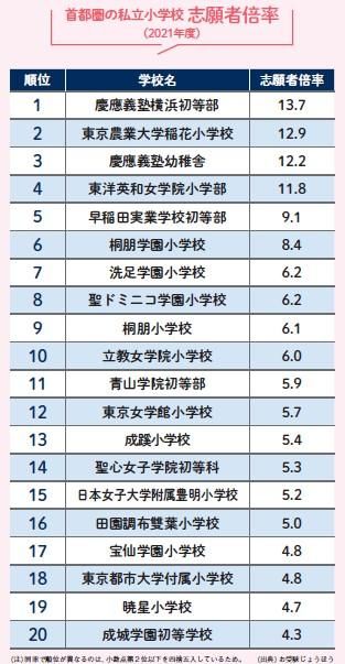 志願者数増加が際立ったのは、東洋英和女学院小学部。昨年は約600人と、20年度の約300人から倍増、志願者倍率は11・8倍となった。 志願者倍率ランキング(別表)では、トップが慶應義塾横浜初等部の13.7倍、続いて東京農業大学稲花小学校の12.9倍、3位は慶應義塾幼稚舎の12.2倍だった。慶應幼稚舎は12.2倍の狭き門! 首都圏私立小「お受験」志願者倍率ランキング 〈dot.〉
