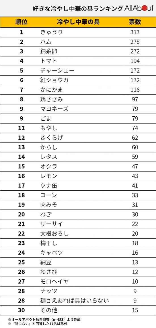 All About編集部は、8月19~22日の間で全国500人を対象に「好きな冷やし中華の具」についてのアンケートを実施TOP3は1位「きゅうり」、2位「ハム」、3位「錦糸卵」という結果になりました。