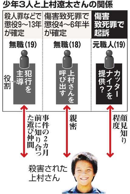 川崎市の河川敷で昨年2月、中学1年の上村(うえむら)遼太さん(当時13)が殺害された事件で、起訴された3人のうち傷害致死の罪に問われた元職人の少年(19)の裁判員裁判が19日、横浜地裁で始まった。被…