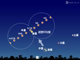 金星と木星の最接近は5月1日(日)6時頃と日が昇ったあとですが、日の出前の時点でも0.2度(満月の見かけの直径4割程度)まで近づく、かなりの大接近となります。 最接近の前後数日間は、双眼鏡の同一視野内で見ることができるほど近づくので注目です。金星はマイナス4等、木星はマイナス2等と明るいため、明け方の東の空でも目を引きます。明るい2つの星が寄り添う姿を探して、空に目を向けてみてください。金星と木星が大接近 5月スタートは明け方の空に注目