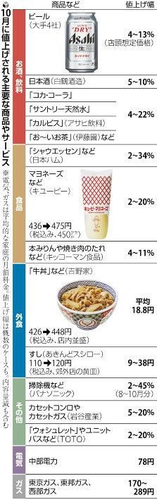 10月は、今年最大規模となる値上げの波が押し寄せる。民間調査会社の帝国データバンクによると、飲食料品6500品超が対象で、9月の2・7倍となる。価格上昇は、家電や住宅設備、電気・ガス料金にも広がっており、家計の負担は増