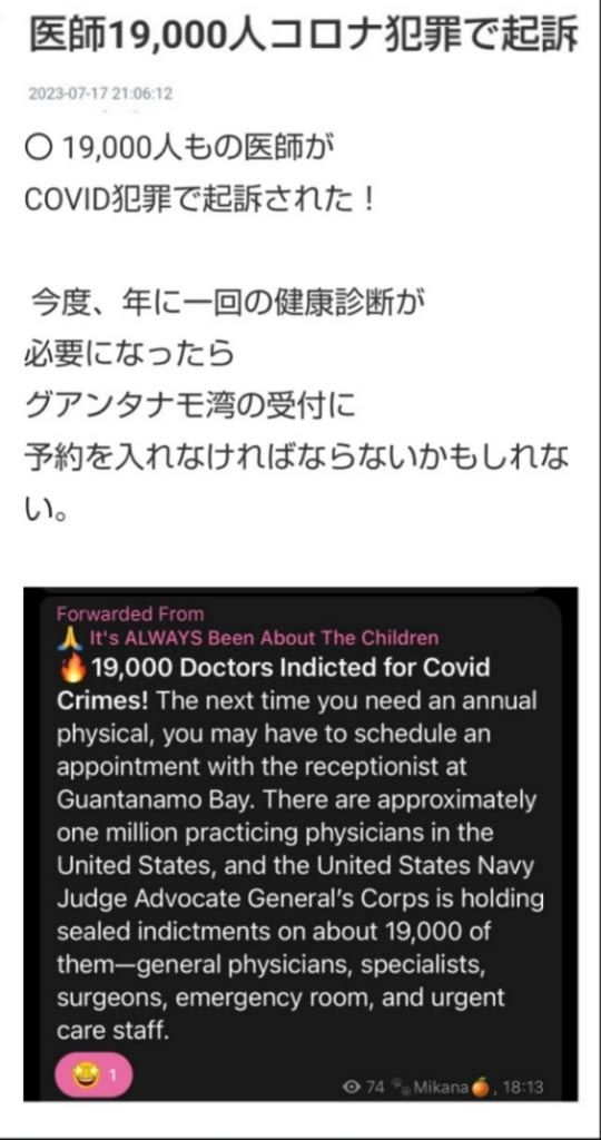 19000人の医師【コロナの犯罪】で起訴!これは氷山の一角で世界的!アメリカでは医師19000人がワクチン接種の犯罪で起訴されている!トランプ【大統領令13818】逮捕処罰!アメリカには100万人の医師がいて、そのうちの19000人の一般医、専門医、外科医、救急外来、急患担当者などが起訴されたようです!世界中の接種に関わった医師や看護師となると、氣が遠くなる数でしょう!今後…トランプ革命で医師が居なくなってもメドベッドや未知の薬などが使えるようになれば何も困らない時代になります!2023年7月20日!医師19,000人コロナ犯罪で起訴|nokoarikonのブログhttps://m.facebook.com/story.php?story_fbid=pfbid0212PWjzjAQDV1xKvMkfCHC...19000人の医師【コロナの犯罪】で起訴!これは氷山の一角で世界的!アメリカでは医師19000人がワクチン接種の犯罪で起訴されている!トランプ【大統領令13818】逮捕処罰!