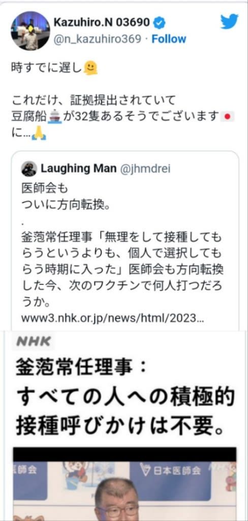 --- 医師会、時すでに遅し!日本・横須賀に豆腐船が32隻あるそうでございます!豆腐船=収監船=ミンチ船!医師会もついにワクチン接種方向転換!釜萢常任理事!無理をして接種してもらうというよりも - みんなが知るべき情報gooブログ ---