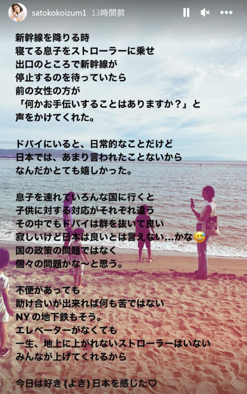 幼い子どもを連れて海外のさまざまな国を訪れると、各国で対応の違いを感じるという。「その中でもドバイは群を抜いて良い」としつつ、一方で「寂しいけど日本は良いとは言えない…かな」と私見を述べた。 (略)小泉は「国の政策の問題ではなく 個々の問題かな~と思う」とし、「不便があっても助け合いが出来れば何も苦ではない NYの地下鉄もそう。エレベーターがなくても一生、地上に上がれないストローラー(※ベビーカー)はいない みんなが上げてくれるから」と説明。その上で、「今日は好き(よき)日本を感じた」と、あらためて思いをつづった。ドバイ移住の小泉里子、ベビーカー問題で各国の違いつづり「寂しいけど日本は…」 - 芸能 : 日刊スポーツ
