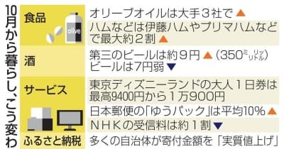 家計の負担が10月から一段と重くなる。4500品目以上の食品が値上がりし、サービス価格も上がる。消費税を払ってこなかった個人事業主はインボイス(適格請求書)制度に参加すれば納税義務が生じる。政府は10月末をめどにまとめる経済対策で物価高対策を5本柱の一つとした。家計負担の軽減につながるかどうかが問われる。 調査会社の帝国データバンクによると、10月に値上げされる食品の品目数は前年同月と比べると半減するものの、9月からは2倍以上に拡大。円安などによる原材料価格の高騰が原因だ。 オリーブオイルは、J―オイルミルズが出荷価格を14~57%引き上げるなど大手3社で上昇する。伊藤ハムやプリマハムはハムなどの加工食品を最大約2割値上げする。 酒税の改正で、割安だった第三のビールの税額は350ミリリットル当たり約9円上がる。店頭価格も同程度上昇する見通しだ。逆にビールの税額は7円弱下がる。 東京ディズニーランドの大人1日券は繁忙期でこれまで最高9400円だったが、1万900円になる。家計負担10月から重く 食品4500超値上げ | 共同通信