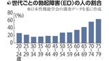 同学会副理事長で順天堂大浦安病院の辻村晃泌尿器科教授らのチームは昨年、オンライン調査を行い、20~79歳の男性6228人の回答を分析した。「性交渉に十分な硬さではない」などと自己評価した人をEDとして集計したところ、全年齢平均は31%だった。20~24歳が27%、25~29歳は22%で、20歳代が30~40歳代(17~19%)を上回った。EDの男性1400万人、20代で2割以上…25年ぶり全国調査で30~40代を上回る
