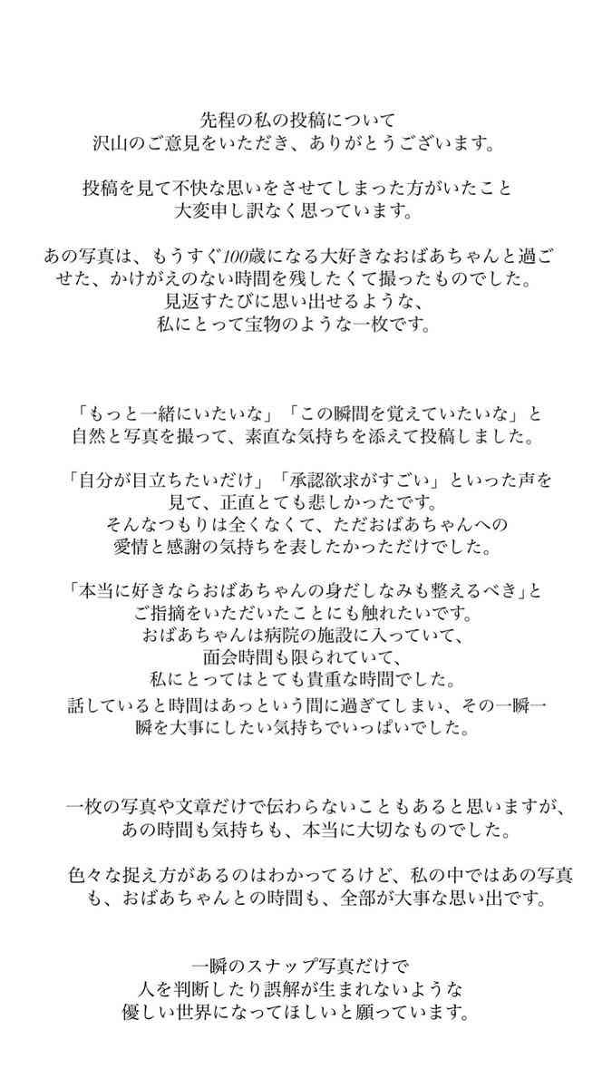 1 匿名さん 25/05/27(火) 14:02 https://encount.press/archives/801797/ 夏芽が「もうすぐ100歳になるおばあちゃん 大好き」と投稿したのは病院のベッドで寝ている祖母の姿だった。患者衣を着用した写真にネット上では「ばーちゃんを道具やと思てるみたい」「承認欲求丸出し」「いくら身内とはいえこれをあげるのはどうかと思う」「おばあちゃん会いにきてくれて嬉しかったと思う」などさまざまな意見が寄せられた。