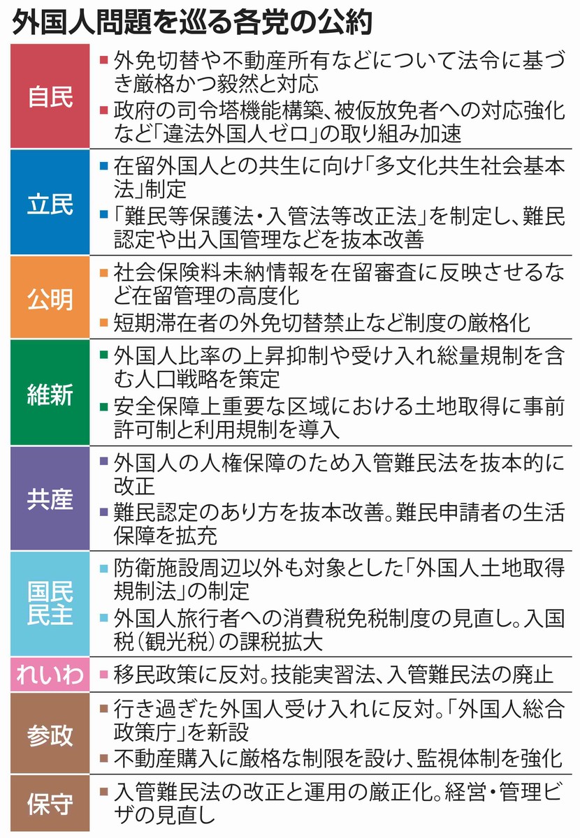 共生に重きを置くのは立憲民主党と共産党だ。立民は「多文化共生社会基本法」を定め、国民と在留外国人が相互に人格と個性を尊重し、支え合う社会を形成すると主張する。野田佳彦代表は党首討論会で、人口減少で労働力が不足していると指摘し「外国人にどんどん来てもらい、働いてもらい、学んでもらう」と、外国人受け入れを拡大する考えを示した。