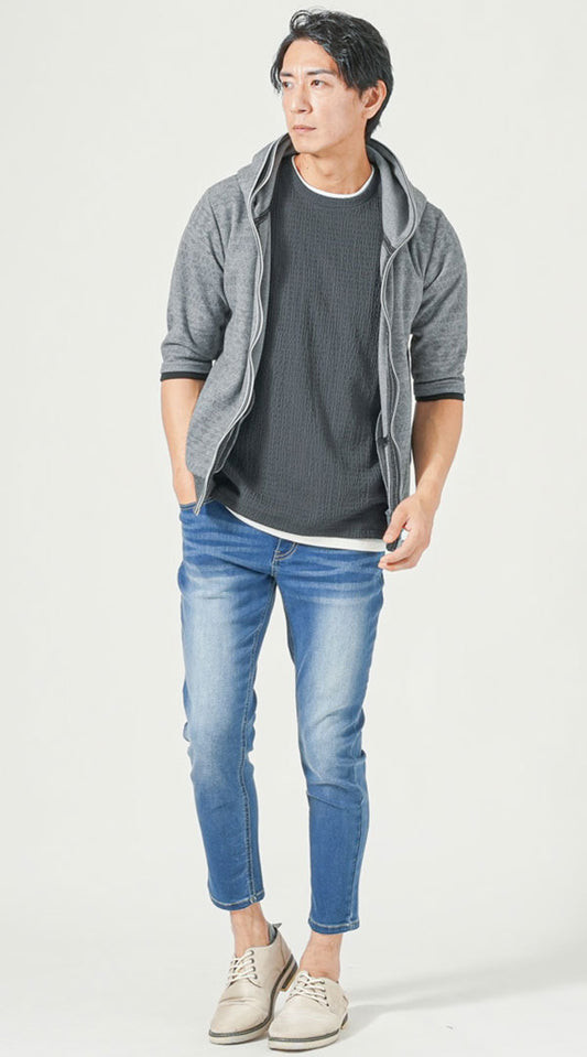 「男性のパーカーいいよね。男性のなんかフード厚めいいよね。なんかぼわっとしてなんか可愛いなって思うな。やっぱ布多けりゃ多い方がいいんだな。タンクトップとパーカーだもんね。比べたら布だな。男性!グレーのパーカーだって。着よ。着ていこ、みんな」