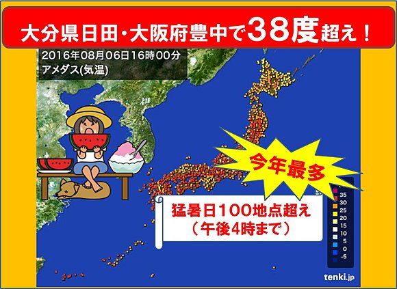 きょうは朝から強い日差しの照りつけた所が多く、各地で猛烈な暑さとなりました。午後4時までに、大分県の日田と、大阪府の豊中で38度以上と体温を大幅に上回る暑さになりました。(2016-08-06 16:29:56)