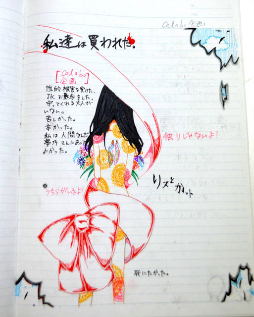 援助交際や風俗、JKビジネスなどで「売春」をした中高生たちが、自らの体験や思いを伝えたいと企画した「私たちは『買われた』展」が11~21日、東京都新宿区で開かれる。写真や文章、日記などを通して彼女たちは訴える。「私たちが、いま、ここで生きていることを知ってほしい」 主催するのは、居場所のない女子高校生らを支援する一般社団法人Colabo(コラボ)と、コラボが支援する24人。14~26歳の中高生や女性らで、北海道から九州で暮らす。かつて立っていた街角、体をくっつけて暖を取った自動販売機、リストカットを繰り返して傷だらけになった腕――。自分の体験が深く関わる場所や場面を再現した写真のほか、思いをつづった日記や絵、体験談など約100点を展示する。 関東地方で暮らす高校1年のあいさん(16、仮名)は中学生のとき、母親と自分に暴力を振るう義父のいる家に帰りたくなくて、新宿に出た。ひとりで下を向いて歩いていたとき、男の人に声をかけられた。私たちは「買われた」展 女子中高生のSOSを知って:朝日新聞デジタル