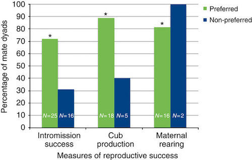 米国と中国の科学者グループが中国・四川省のジャイアントパンダ保護研究センターで行った実験では、複数のオスとメスを柵で区切って「お見合い」させ、好意的な態度を示した相手と、攻撃的あるいは無関心な態度を示した相手を選び出した。お互いに好意的なカップルを同じ檻に入れると、繁殖の成績は高かった。しかし攻撃的あるいは無関心な相手では、繁殖はうまくいかなかったという。