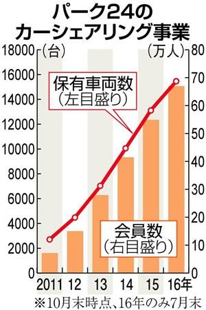 「パーク24」カーシェアリング事業での会員数と保有車両数の推移 同サービスを展開するパーク24は、7月末の会員数が約67万人、保有車両数は1万5467台となった。 4年前に比べそれぞれ5.3倍、3.6倍に膨らんでいる。「マイカー感覚で利用する会員が増えた」(経営企画本部)と市場拡大に手応えをみせる。 米配車サービスのウーバーテクノロジーズや米民泊仲介のエアビーアンドビーなど米国で先行したシェアリングエコノミーは、日本市場にも着実に浸透しつつある。 日本総合研究所の下田裕介副主任研究員は「国内でも若者を中心に消費行動は大きく変化する」と指摘する。 ニーズの多様化 こうしたモノ離れが進む市場で、いかに消費を促すか。 後略