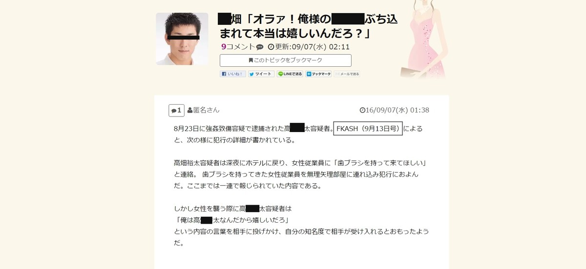 8月23日に強姦(ごうかん)致傷容疑で群馬県警に逮捕された俳優の高畑裕太容疑者(22)がレギュラー出演することが決まっていた日本テレビの新番組「1周回って知らない話」(水曜後7・00)が7日、2時間スペシャルでスタートした。 今さら聞けない芸能人の疑問「1周回って知らない話」を本人に直撃する新感覚トークバラエティー。司会は東野幸治(49)、アシスタントは川田裕美アナウンサー(33)。川田アナはフリー転身後、ゴールデンタイム初の進行役となる。 オープニング、東野と川田アナがあいさつした後、スタジオを俯瞰する映像に。「スタジオには10代~20代の今どきの視聴者60名」というテロップとともに、司会者席&ゲスト席を取り囲む観客席が映された。 正面観客席の前列に座る高畑容疑者に画像加工(グレー色のボカシ)がなされ、姿が消された。高畑容疑者は、今どきの視聴者と同じ気持ちでスタジオに参加する“今どきの芸能人”として呼ばれ、同じ藤田ニコル(18)乃木坂46の秋元真夏(23)の間に座っていた。 その後、最初のゲスト・宮根誠司キャスター(53)が登場。スタジオ中央に設置された司会者席&ゲスト席の後方に、正面観客席が映らざるを得なく、またも高畑容疑者のボカシ処理が映し出された。 宮根キャスターのパートは“モザイク”が頻繁に映った。出演シーンが多く、出演シーンのカット対応は厳しかったとみられる。高畑容疑者 新番組でボカシ処理 日テレ「1周回って知らない話」 ― スポニチ Sponichi Annex 芸能
