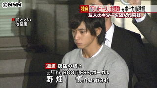 かつてロックバンド「The ROOTLESS」のボーカルとして人気アニメ「ワンピース」の主題歌を歌っていた建設作業員の野畑慎容疑者が、居候していた友人男性宅からギター2本を盗んだとして逮捕された。ギターは現金約20万円に換金。容疑を認める。
