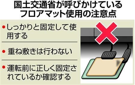 福岡市博多区の原三信(はらさんしん)病院にタクシーが突っ込み3人が死亡、7人が負傷した事故で、事故車両の運転席で足元のフロアマットが二重に敷かれていたことが9日、捜査関係者への取材で分かった。福岡県警は、上部のマットがずれてアクセルペダルを押さえ込む形となった結果、タクシーが暴走した可能性もあるとみて慎重に捜査している。 事故は3日午後5時ごろ発生。タクシーは近くの公園から病院方向へ直進し、道路左側に駐車していた車2台をよけるように走行。病院前の標識にぶつかって損壊させた後、病院に突っ込んだ。 これまでの県警の調べに、運転手の松岡龍生容疑者(64)=自動車運転処罰法違反容疑で逮捕=は「ブレーキが利かず、途中の一時停止標識も止まれなかった。公園を出発した直後からブレーキがおかしかった」などと供述している。 捜査関係者によると、タクシーの運転席の足元には、備え付けのマットの上に別のマットが重ねて敷かれていた。2枚はメーカーの純正品と市販の社外品で、上に敷かれたマットは特に固定されていなかったという。福岡タクシー突入 二重マットで制御利かず? アクセル固定の可能性(産経新聞) - Yahoo!ニュース