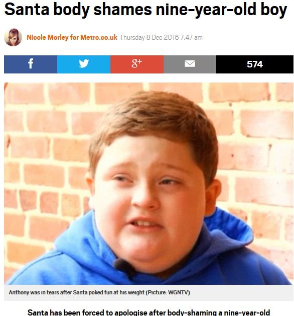 英紙『Metro』が報じたところによると、12月3日の土曜日に2児の母であるアシュリー・メイズさんは、米ノースカロライナ州フォレスト・シティのメインストリートに設置されたサンタハウスに息子たちを記念撮影のために連れて行った。そこでアントニー君(9歳)は、iPodとドローンをクリスマスプレゼントに欲しいと思っていることをサンタに伝えた。 するとサンタは、アントニー君への返答として「まずはハンバーガーとフレンチフライを食べるのを止めろ」と言い放ったのだ。アントニー君は自分の体型を侮辱されたと酷く傷つき、サンタハウスの外に出て泣き出してしまった。 そばで見ていた母アシュリーさんは「どうして息子を連れてきてしまったんだろう」と激しく後悔し、また子供を傷つけるような発言をしたサンタに「なんて失礼なの」と怒りを覚えたという。 大好きなサンタに自己否定されてしまったアントニー君。その落ち込んでいる姿を見てアシュリーさんが抗議したところ、サンタはアントニー君に謝罪したという。しかしその後、アントニー君はサンタと撮った写真を破ったそうだ。 アシュリーさんは「あんなサンタ、クビにするべきよ。うちの子が味わったような不快な気持ちをどの子供にも味わってほしくないわ。アントニーはあのサンタの言葉にめちゃくちゃ傷つけられたのよ」と怒りを露わにしている。 楽しいはずのサンタとの触れあいや記念撮影が、「嫌な記憶」として思い出に残ってしまうとは…。アントニー君の夢を叶えるどころか侮蔑の言葉を発したサンタは、6日付けで解雇されたという。【海外発!Breaking News】9歳児に「まずハンバーガーとポテトをやめろ」 “暴言サンタ”解雇される(米) | Techinsight|海外セレブ、国内エンタメのオンリーワンをお届けするニュースサイト