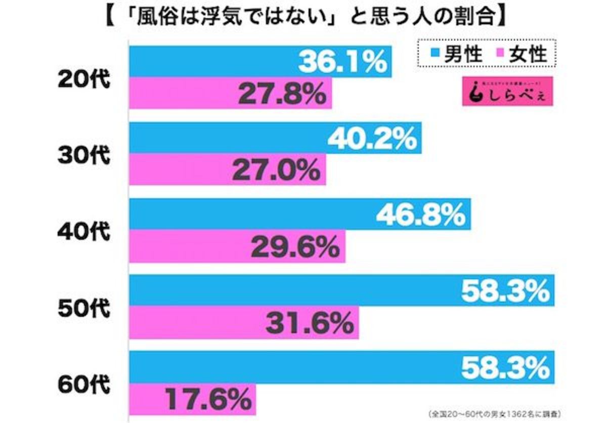 「風俗は浮気ではない」と考える男性の割合は、年代が上がるとともに増加し、5、60代男性では6割に迫る。 過ごしてきた時代の違いや、「家庭はセックスレスになっているが、愛人をつくるわけにはいかず…」といった、若い世代より切迫した事情もあるのかもしれない。 60代男女における格差はじつに40ポイントを超え、もし仮に60代夫婦において「夫の風俗通い」が明るみに出たら、認識の違いから大喧嘩になりうることが、想像に難くない。
