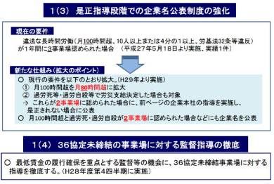 違法な長時間労働を課した大企業の社名を行政の裁量で公表する基準は、昨年に運用をスタート。「月100時間以上の違法な長時間労働を10人以上か4分の1以上の従業員で確認した事業所が1年間に3カ所あった場合」としていたが、これまでに適用されたのは1件のみで、実効性が疑問視されていた。 新たな基準は来年早々にも運用を開始。違法な長時間労働の時間は80時間以上、事業所数は2つに引き下げるほか、月100時間超の違法な長時間労働と、過労死や過労自殺などによる労災支給が2つの事業所であった場合も公表対象にする。違法残業「月80時間超」で社名公表 「過労死ゼロ」緊急対策