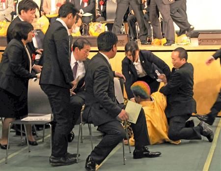 茨城県つくば市で行われた成人式で、乱闘騒ぎが発生した。つくば中央署は8日、式典中に警察官の制止を振り切り壇上に立とうとしたとして、公務執行妨害の疑いで会社員の少年(19)を現行犯逮捕した。同署によると、少年からはアルコールが検出された。 市などによると、式典は8日午後1時半から同市内のつくばカピオで、新成人1624人が参加して行われた。来賓を紹介中、新成人とみられる別の男性1人が壇上に上がり、絶叫。さらに5人ほどが続こうとしたが、来賓として招かれていた石井啓一国土交通相(58)=公明党茨城県本部=のSPや市職員らが若者数人を羽交い締めにしたり、首投げするなどして制止。場内は騒然となり、式典は約15分中断した。石井国交相や職員にけがはなかった。 会場周辺では、数十人が改造車やバイクで乗り付け、道路の中央で国旗を振り回すなど騒ぎは続いた。 つくば市の五十嵐立青市長は「昨年よりも警備態勢を強化していたにもかかわらず、このような事態を招いてしまったことは遺憾」とのコメントを出した。つくば市の成人式で乱闘騒ぎ 石井啓一国交相のSPが首投げで制止 - ライブドアニュース