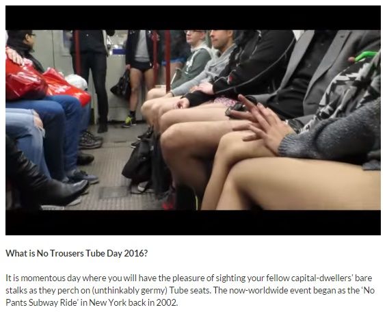この画像は英メディア『london24.com』によるその記事のスクリーンショット。前回、ロンドンの地下鉄はホームや車内も太ももから脛までを露出した人々で大賑わいであったとのこと。今年は今月10日の日曜日に“No Trousers Tube Ride in London(ズボン無しで地下鉄に乗ろう)”として予定されていると告げ、人々の参加意欲をあおってみせた。