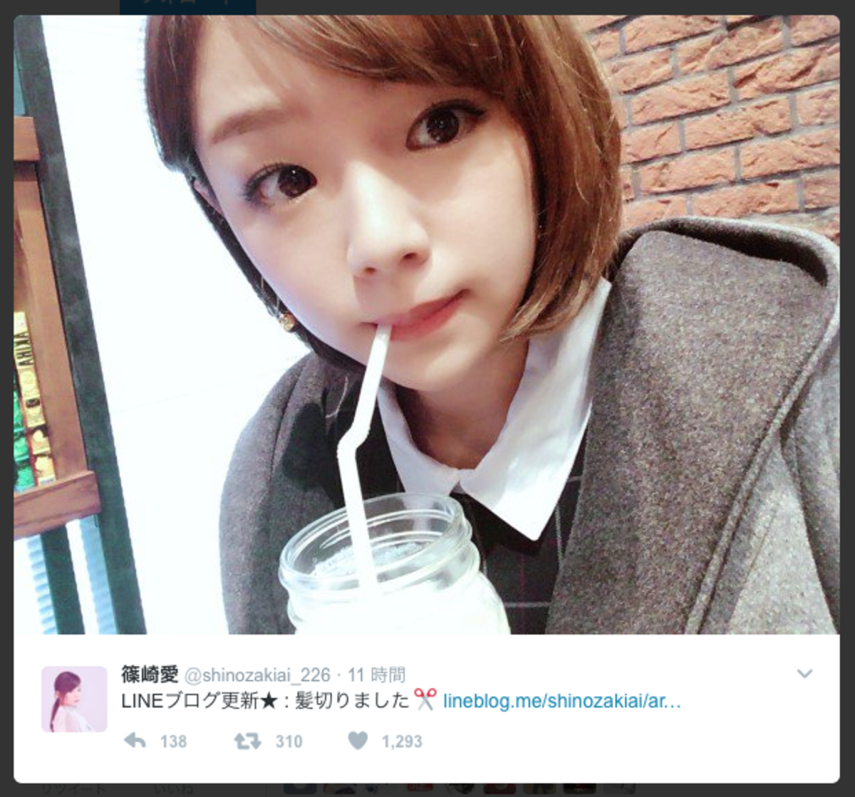 タレントや歌手として活躍する篠崎愛が1月23日、ブログおよびTwitterを更新。「髪切りました」とのタイトルで、あご上の長さのショートボブヘアを披露した。1月18日にはTwitterにて「髪少し切ったよ」と報告し、鎖骨下あたりのミディアムヘアの写真を公開していた彼女だが、今回披露された新しいヘアスタイルと比べると約10センチ程度カットされたと思われ、ガラッとイメージが変わっている! なお、ヘアスタイルが変わっても篠崎の可愛さはもちろん健在。彼女は新しいヘアスタイルについて「2年ぶりくらいかな??」と短い長さが久しぶりであることを綴り、「ドライヤーが楽」とコメントしている。