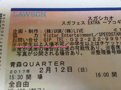 シンガーソングライターのスガシカオさんが2月12日、ファンのツイートしたチケット写真をリツイートして話題になっています。チケットは同日、青森県で開催される「スガフェス EXTRA ~アコギ侍の宴~」のものなのですが、よく見るとそこには「※小学生以上入場不可」の印字が。“以下”ではなく“以上”。単なるミスプリントのようですが、スガさんもこれには「幼稚園児しか入れないっ汗」とツッコミを入れています。 この“スガシカオ幼稚園児オンリーライブ”という激レアチケットに対してTwitterでは、「厳しい規約wwww」「園児相手のlive(笑)」「素晴らしい情操教育です」「スガさん歌のおにいさんみたいになりますね」と、かわいらしいライブを想像する人が続出。「私なら『お腹の子に聴かせます』と妊婦作戦で入場する」「4さいです!!」と入場戦略を立てる人もいれば、「これで満員になればこの先40年は安泰ですよw」という逆転の発想をする人まで登場しました。あなたが天才か。