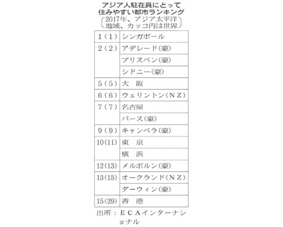 【香港=何楽怡】英人材会社、ECAインターナショナルはアジア人駐在員向けの「住みやすい都市」ランキングを発表した。アジア太平洋のトップはシンガポールで、世界でも1位だった。世界1位は16年連続。日本の都市では大阪が世界、アジアともに5位、名古屋が同じく7位だった。一方で、中国本土の都市は世界で100位にも入らなかった。